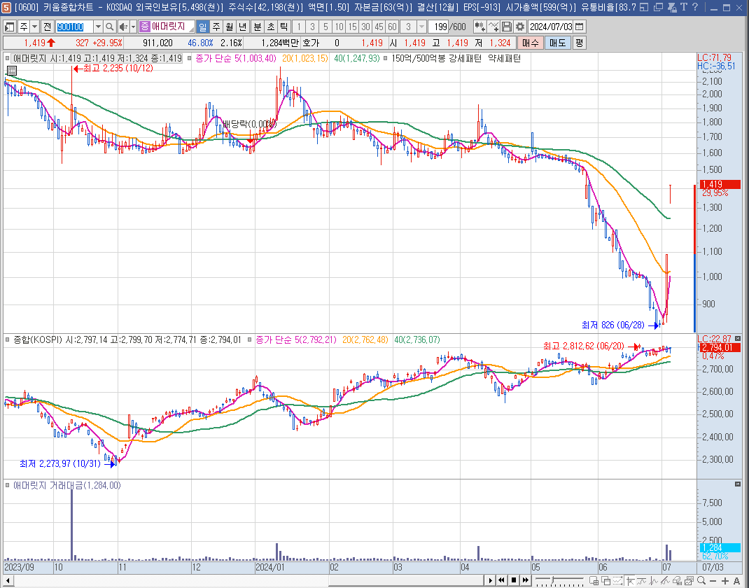 애머릿지 +29.95% 거래량 91만주 거래대금 50억 시가총액 12억