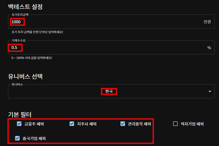 기본 필터는 금융주 지주사 관리종목 중국기업은 제외했습니다.