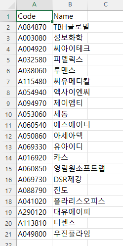 열어보니 아래와 같은 종목 20개가 나왔습니다.