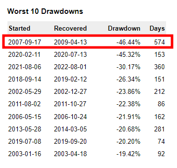 이 결과는 최악의 MDD 10개를 보여주고 있습니다. 제일 안 좋았던 MDD가 -46.44%인데 회복하는데 574일 걸렸네요. 과연 계속 이 전략만을 운용했다면 과연 버틸 수 있었을지는 의문이 듭니다.