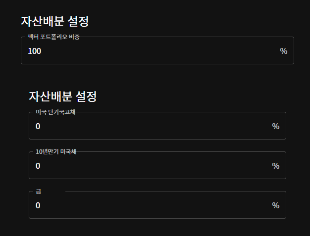 그럼 자산배분을 하기 위해서는 각각의 자산에 자기가 원하는 만큼의 비율을 입력해주면 됩니다.