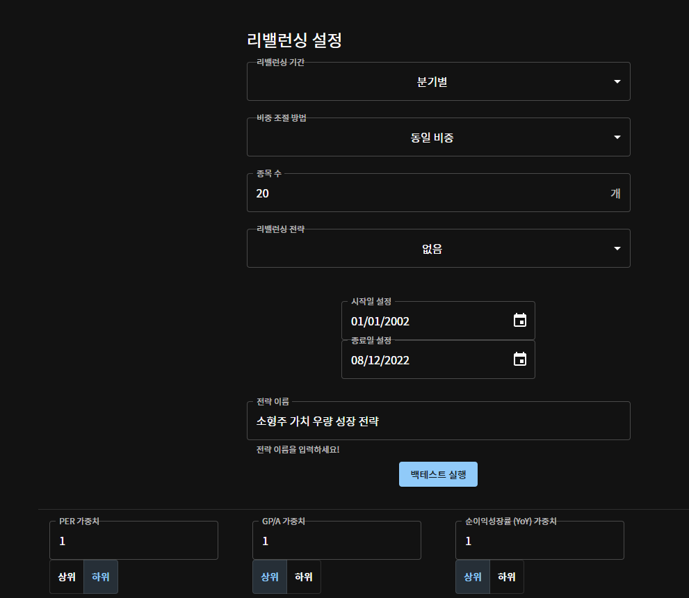 전략 이름은 소형주 가치 우량 성장 전략이라고 지었습니다.