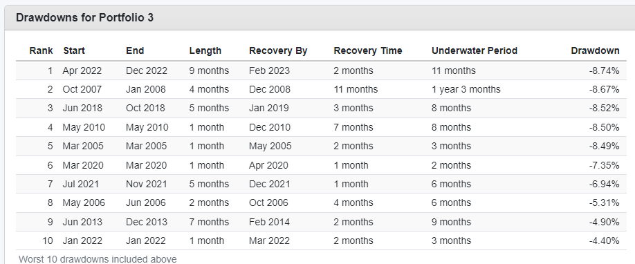그럼 port2번의 MDD를 자세히 살펴보자. MDD가 15% 이하로 떨어진적은 한번만 있지만 아마도 포트를 운영하다 보면 MDD를 갱신하는 경우는 자주 발생할 것으로 예측된다.
