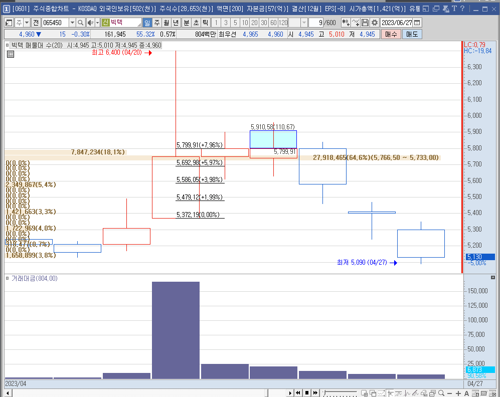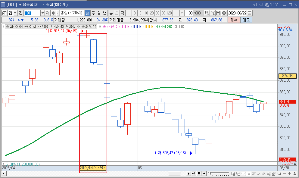 23년 4월 20일을 기점으로 5일동안 8% 넘게 하락하는 구간이다.