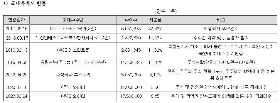최대주주가 지속적으로 변하고 있고 최근엔 디와이디 라는 화장품 회사가 지분율을 높여 가고 있다.