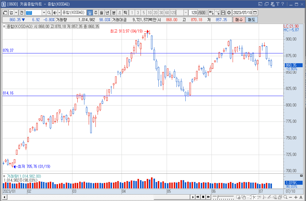 7월 7석날 외국인 기관 금융투자 투신등 계속 매도세를 이어가면서 시장은 하락세이다.