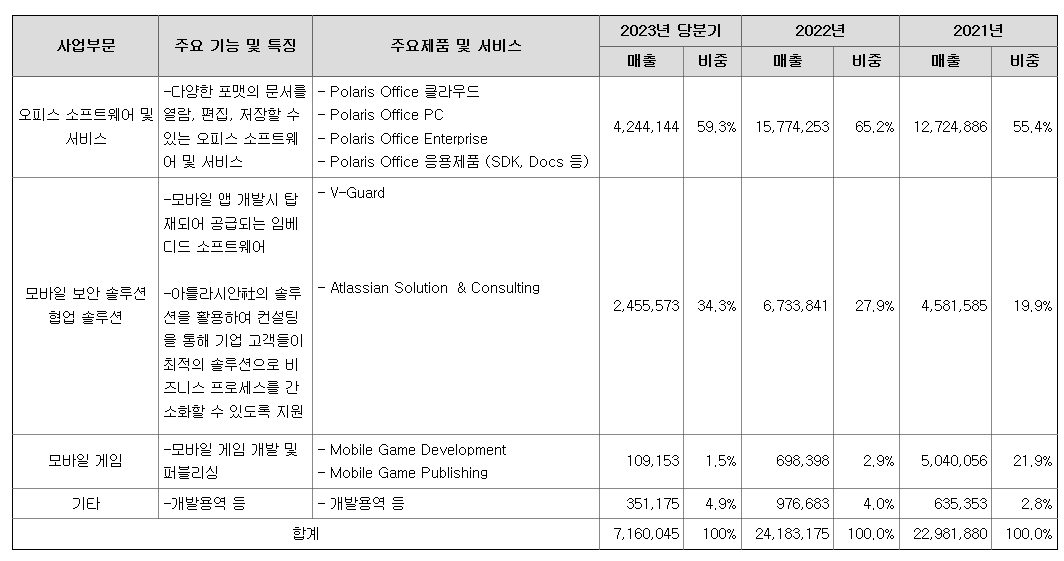 - 동사는 폴라리스 오피스(Polaris Office), 모바일 백신솔루션 (V-Guard), Atlassian 솔루션, 모바일 게임 사업 부문을 영위하고 있음. 단말기나 이동통신사 앱스토어의 보안 검증을 위한 플랫폼 개발 및 유지 보수를 하는 보안 플랫폼 사업을 영위함. 폴라리스 오피스 클라우드 서비스는 2022년 9월말 기준 243개국 1.2억명의 가입자를 확보한 상태로 사용자가 지속적으로 증가하고 있음.