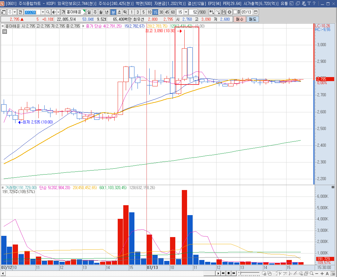 15분봉이다. 아래 빨간 박스 부분에서 2760원에 1차매수되고 2910원에 익절했다.